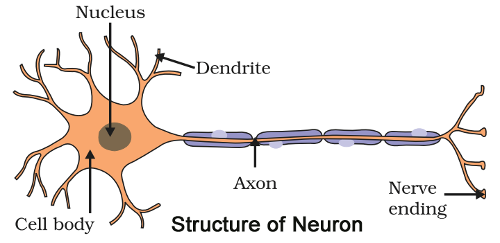Information from receptors → dendritic tip of nerve cell → sets off a chemical reaction → generation of electrical impulse → impulse to cell body → axon → axonal end releases chemicals → chemicals cross the gap (synapse) → generation of electrical impulse in dendrite of the next neuron → impulses deliver to muscle cells or gland.